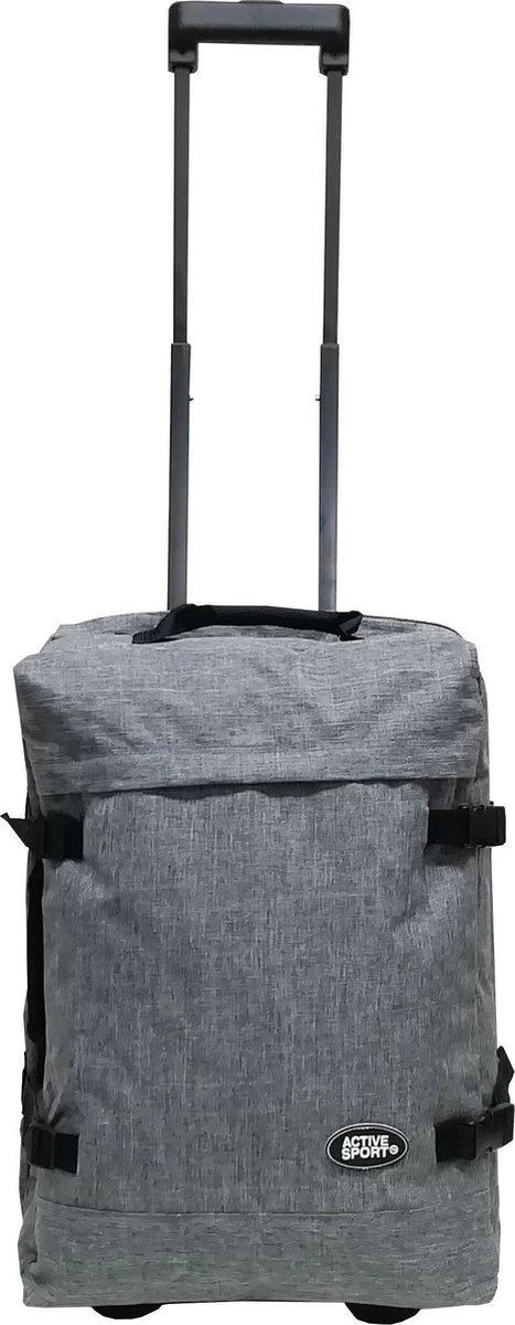 Handbagage formaat wieltas van Active Sport. Deze compacte wieltas bevat twee ruime hoofdcompartimenten die afzonderlijk afsluitbaar zijn. Mocht u een keer niet zoveel bagage hebben dan kunt u één van de twee compartimenten gebruiken en de wieltas middels de spanbanden aansnoeren zodat hij wat smaller wordt. Op de voorzijde zit een ruim ritsvak en aan de boven- en zijkant zit een handvat voor het makkelijk beetpakken van de wieltas. De uitschuifbare trekstang en de 2 wielen zorgen voor optimaal reiscomfort.