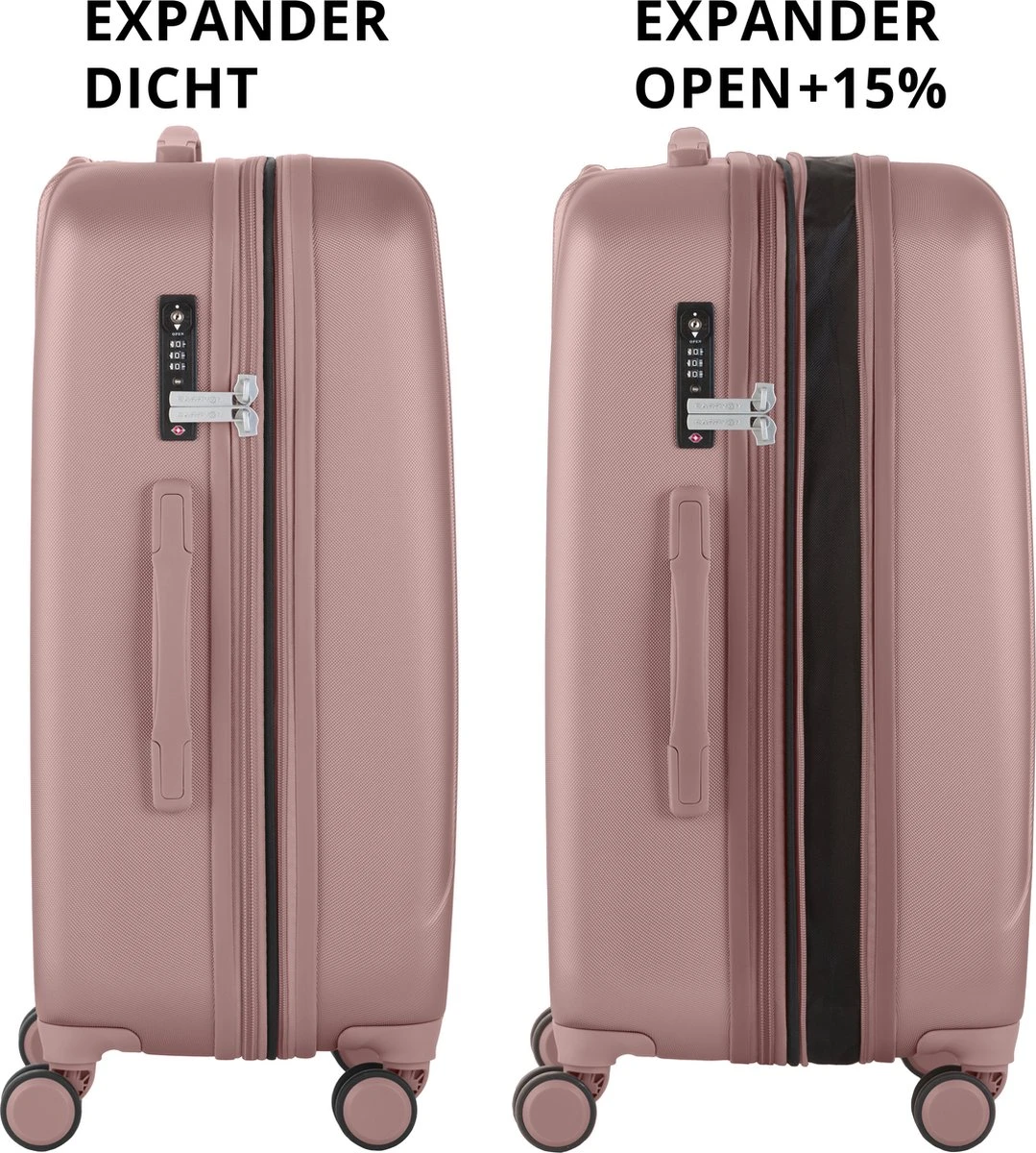 Middels een expander de op de rits van de middenmaat koffer, geeft de koffer bijna 15% extra literinhoud wanneer deze volgepakt zit. Net die extra kledingstukken mee op reis!