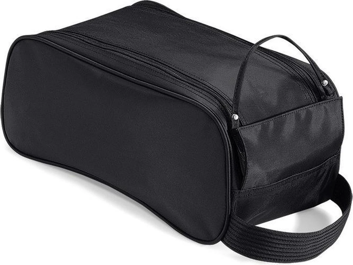 Zwarte schoenentas 9 liter voor 1 paar schoenen. Voorzien van dubbele ritssluiting. Inhoud: 9 liter. Formaat: 35 x 18 x 16 cm. Materiaal: 100% nylon 420D. Reistas/opbergtas.